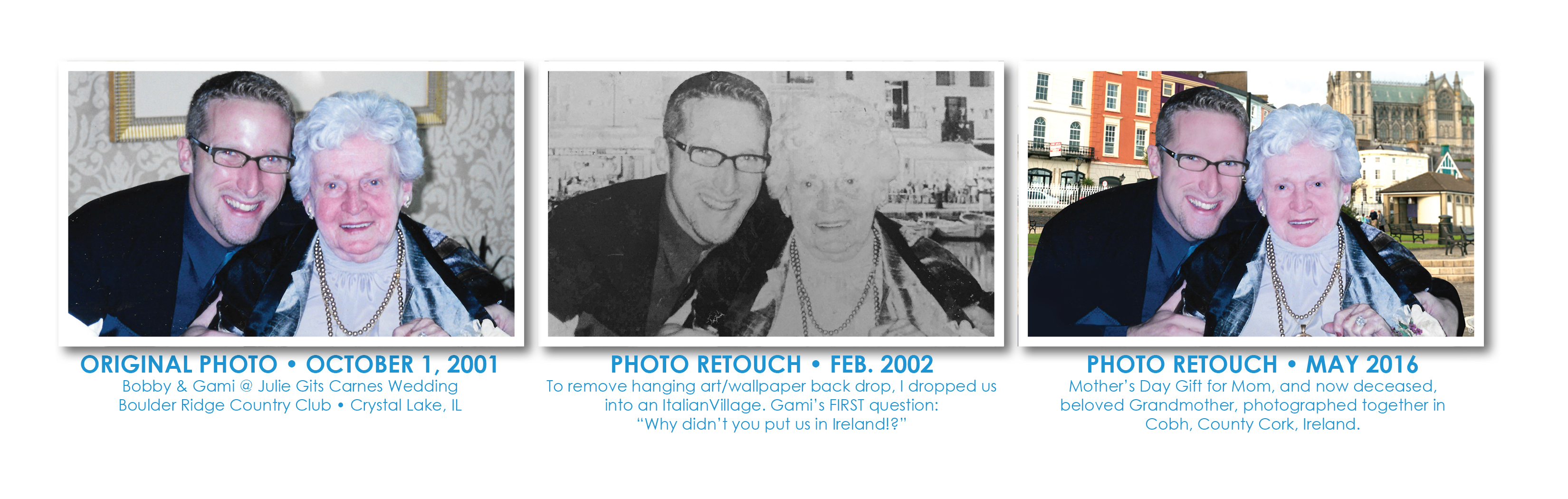 1) Original Photo Taken at Wedding of My Grandmother and I. 2) A Scan of a damaged, touched up photo made to be black and white, with a background of a port city in Italy. 3) An updated, full color. retouched image. now placed in County Cork. Ireland. posthumously for my beloved “Gami” for my Mom last Mother’s Day.