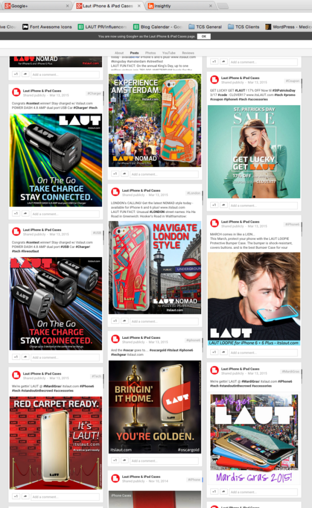 At Total Corporate Solutions, I was a one-man Marketing+Art Department! My tools: A stack photos of models from a spring photo shoot. and a stack of phone-accessory product shots (Client: LAUT). It pushed me to wear many hats to produce, copy write, design, schedule out and update CUSTOM marketing campaigns onto client web sites and across Social Media platforms, both images that I had to design from scratch and posts I had to write including hash tags for: INSTAGRAM; FACEBOOK; SNAPCHAT; GOOGLE+& client BLOGposts. For Blog Posts, all I was give was an article title. ALL Concepts & Design were original. Additionally, the top 3 templates are custom SNAPCHAT filters made for a SPECIAL EVENT DAY while I was at PRODEGE/SWAGBUCKS.